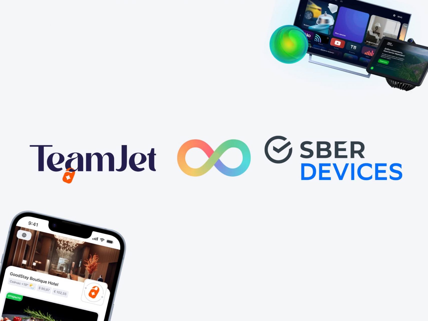 Например, компания TeamJet внедряет систему управления персоналом и сервис для продаж услуг отеля GoodStay в интерактивное решение для отелей «Салют Отель», установленное на умные устройства Sber. Расскажем как будет работать экосистема на примере интеграции продуктов этих компаний.