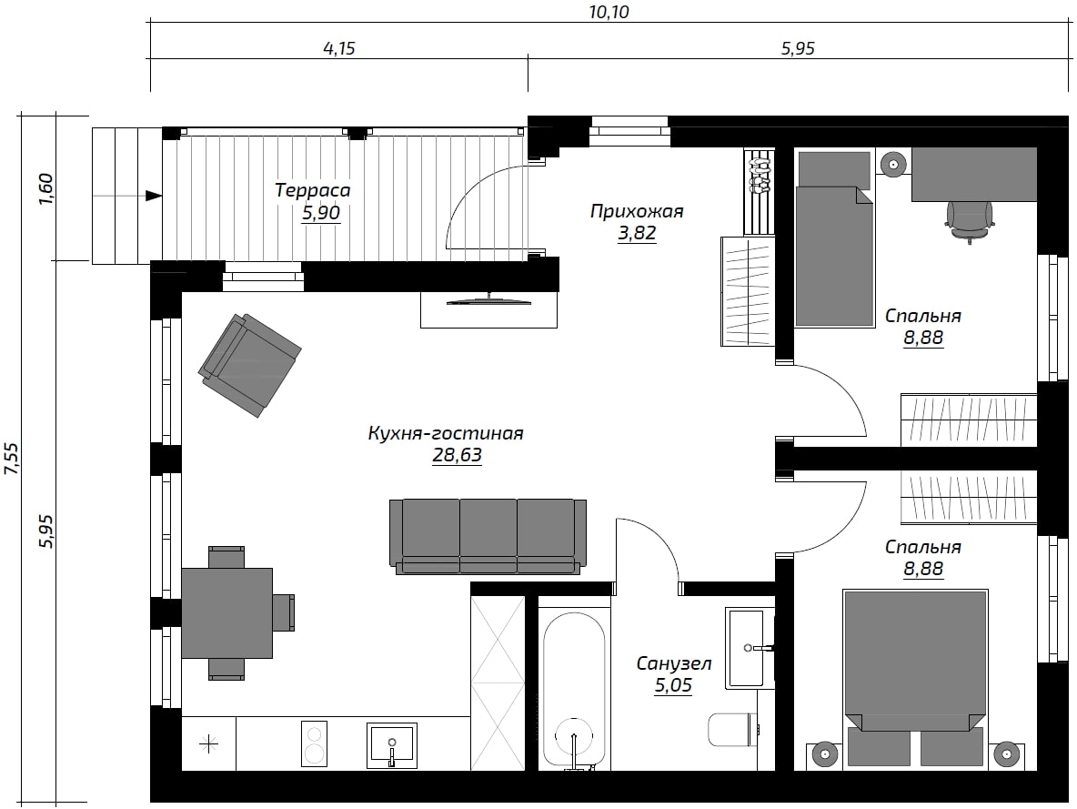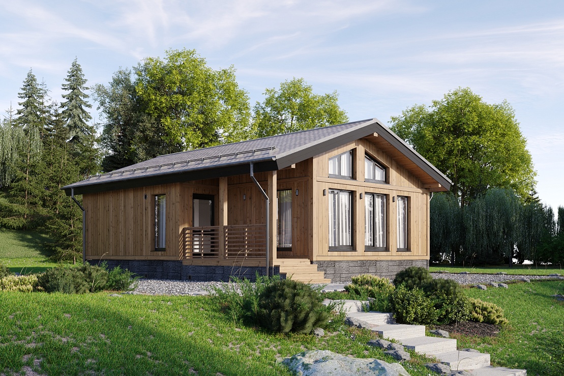 Такой дом впишется и в плотно застроенный малоэтажный массив, и на ландшафты со сложным рельефом и перепадами высот — причем в последнем случае его можно окружить террасами с любой стороны. По планировке — классический гостевой дом комфорт-класса с двумя небольшими спальнями и просторной кухней-гостиной.