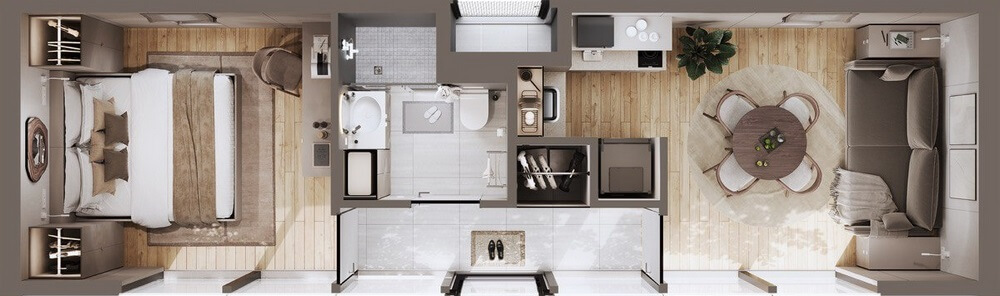 За зеркальными фасадами с энергосберегающим остеклением — полноценный дом в формате «евродвушки»: на 33 кв. м площади разместилась функциональная прихожая с встроенным шкафом, кухня-гостиная с двухместным раскладным диваном, санузел с душевой кабиной и бойлером, спальня с кроватью королевского размера и местами для хранения.