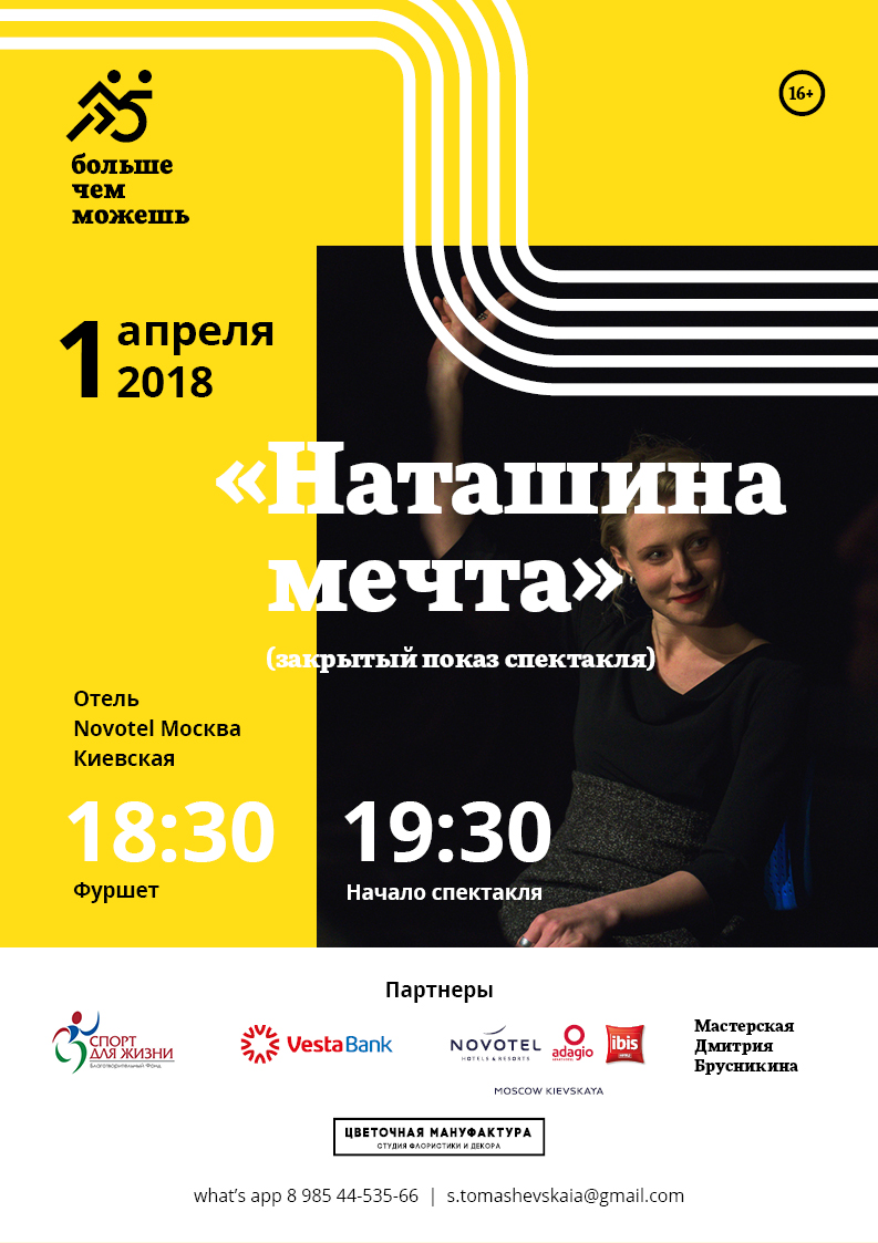 В воскресенье, 1 апреля 2018, в отеле Novotel Москва Киевскаяпо адресу ул. Киевская, д. 2 пройдёт специальный благотворительный вечер, создателями которого является спортивное движение «БольшеЧемМожешь». Для гостей выступят актеры мастерской Дмитрия Брусникина - сыграют один из своих самых знаменитых спектаклей «Наташина мечта» и расскажут пронзительную и трогательную историю от имени юной девушки, воспитанницы детского дома.
