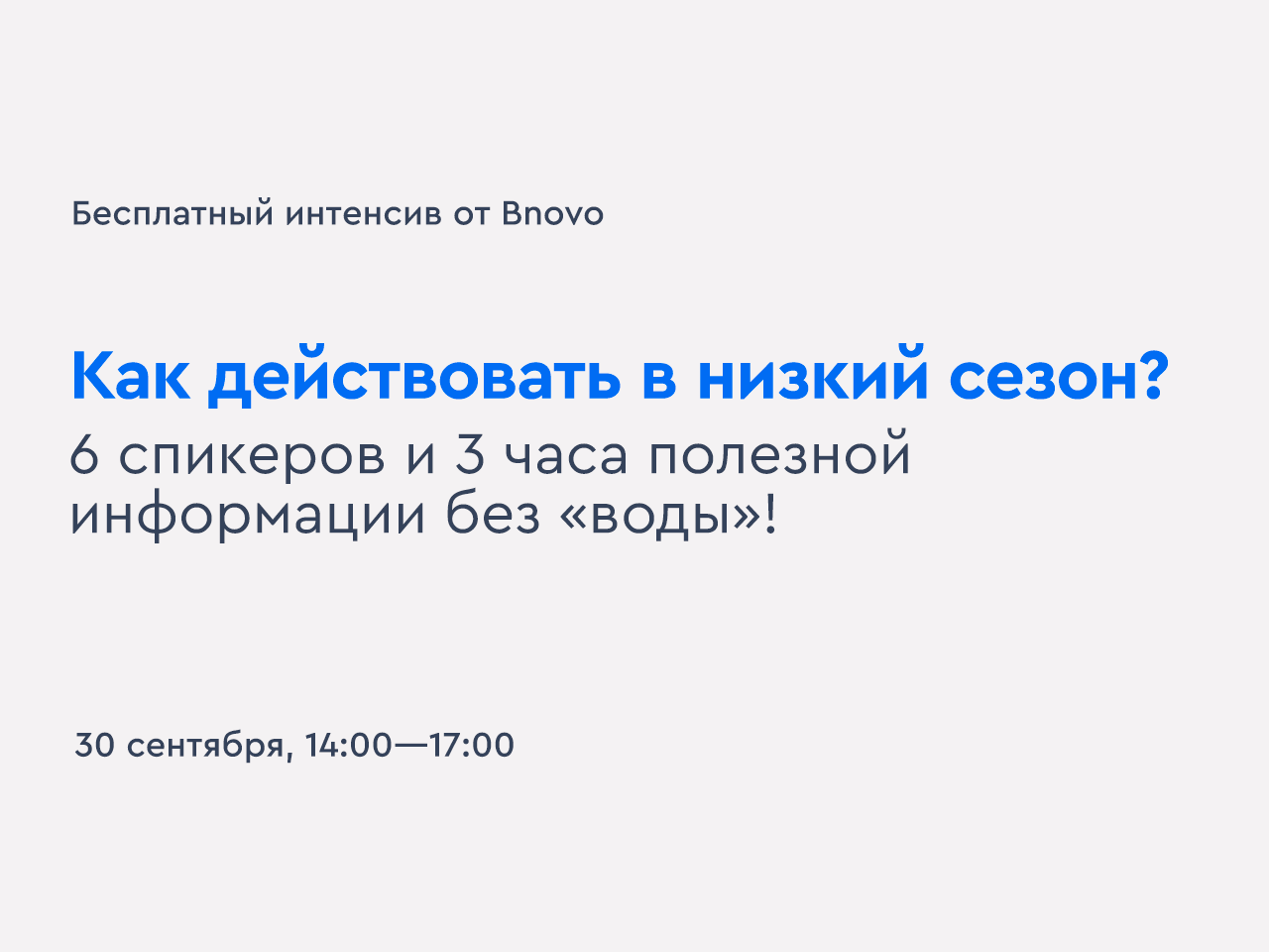 30 сентября состоится масштабный онлайн-интенсив по низкому сезону. На нем вы сможете узнать всё про то, как подготовиться к низкому сезону и как сохранить свою эффективность во время него.