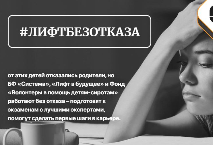 Подростки в сложной жизненной ситуации испытывают сложности с выбором профессии, редко поступают в высшие учебные заведения и с трудом делают первые шаги в карьере. В рамках проекта «Лифт без отказа» БФ «Система», «Лифт в будущее» и партнерский фонд «Волонтеры в помощь детям-сиротам» помогают выбрать профессию и поднять академический уровень до поступления в вуз или учреждение среднего профессионального образования. Для компаний-партнеров участие в проекте «Лифт без отказа» является реализацией их социальной повестки и стратегии устойчивого развития Корпорации.