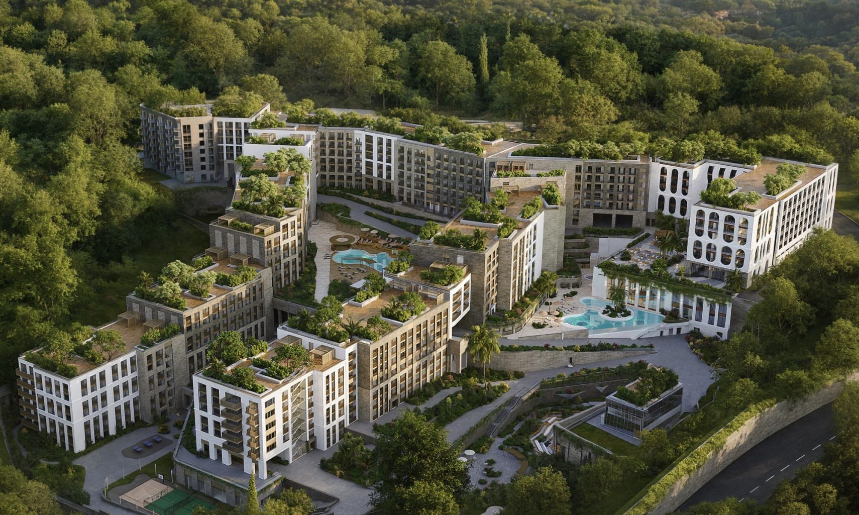 Обещают, что все номера оснастят системой "умный дом" (вернее, в данном случае - "умный номер") и усиленной звукоизоляцией. Также тут запланирован целый гастрономический кластер из нескольких ресторанов, кафе и баров. Также в инфраструктуре предусмотрены крупная спортивная зона с фитнес-территориями "на природе" - куда входят прогулочные экотропы, интегрированные в естественный ландшафт с бамбуковой рощей, веломаршруты, паддел-корты. Еще семь бассейнов, включая подогреваемые, с морской водой и гидромассажем.