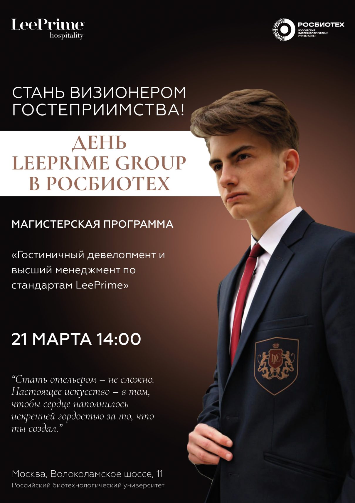 21 марта в РОСБИОТЕХ состоится день LeePrime Group, где абитуриенты смогут получить подробную информацию о программе магистратуры. ФГБОУ ВО «РОСБИОТЕХ» (Российский биотехнологический университет) запускает программу «Гостиничный девелопмент и высший менеджмент по стандартам LeePrime Group», которая разработана в сотрудничестве с компанией LeePrime Group - индустриальным партнером университета в сфере гостеприимства. Она направлена на подготовку высококвалифицированных специалистов в области управления гостиничными проектами и объектами с полным погружением в сферу гостеприимства.