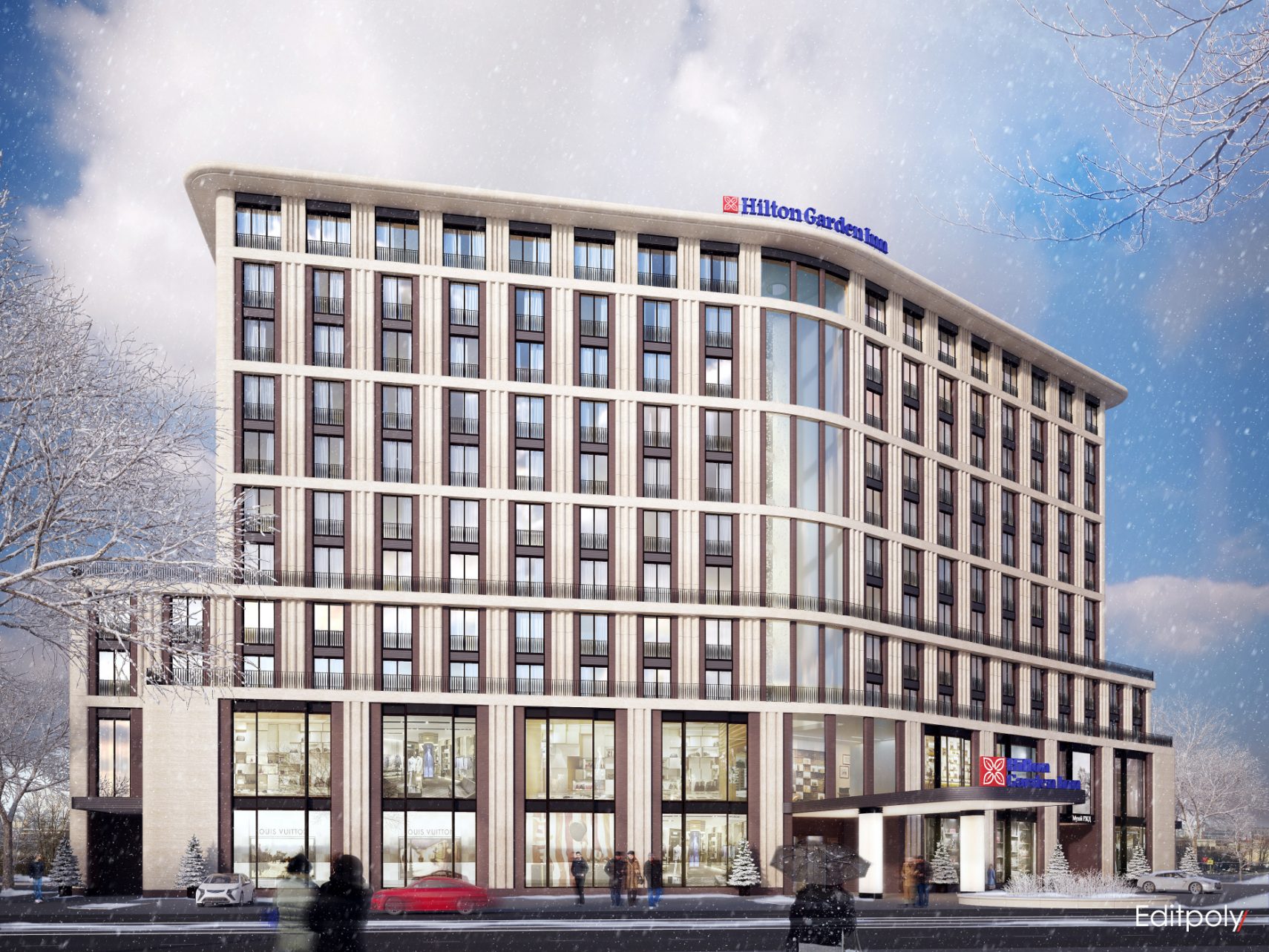В здании отеля также расположатся просторное фойе на первом этаже, мини-маркет, оборудованные конференц-залы, рестораны и лобби-бар, бизнес-центр, тренажерный зал и прочее. Для гостей предусмотрены подземная и наземная парковки.