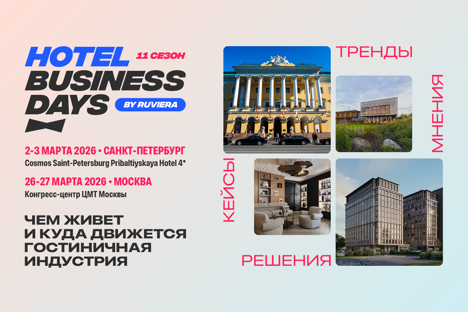 2–3 марта Hotel Business Days состоится в Санкт-Петербурге в Cosmos Saint-Petersburg Pribaltiyskaya Hotel 4*, а 26–27 марта в Москве в конгресс-центре ЦМТ Москвы.
