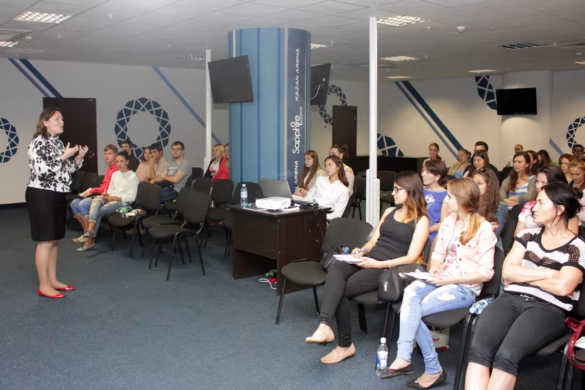Линейный персонал прошел обучение на территории стадиона «Казань-Арена» по трем темам. Первая тема: «Эмоциональный сервис и эффективные коммуникации» была направлена на изучение и отработку механизма работы с посетителями. Участники учились правильно устанавливать диалог с посетителями и работать в команде, работать с возражениями и жалобами гостей.
