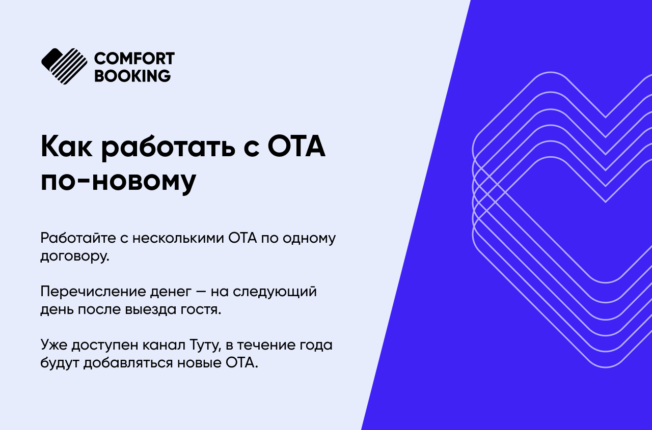 Комфорт Букинг – комплексное решение для автоматизации отельного бизнеса. Компания предоставляет услуги интернет-эквайринга, автоматизации возвратов и оптимизации работы с каналами продаж.
