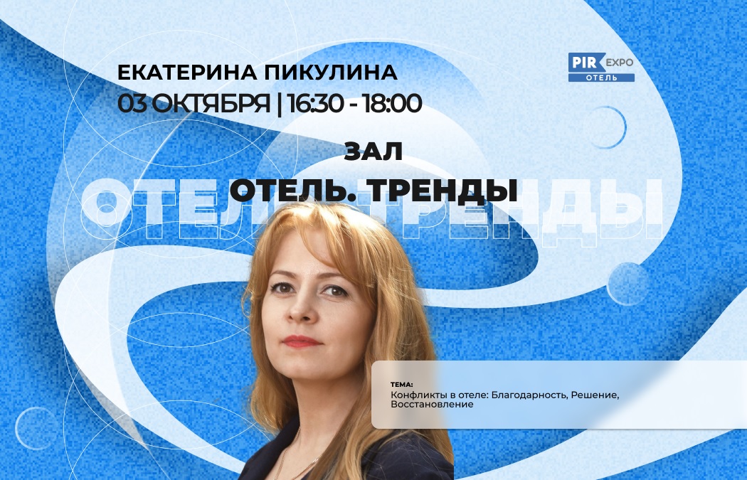 3 октября в рамках деловой программы ПИР ОТЕЛЬ Екатерина Пикулина - ведущий тренер компании BigTree проведет сессию «Конфликты в отеле: Благодарность, Решение, Восстановление»