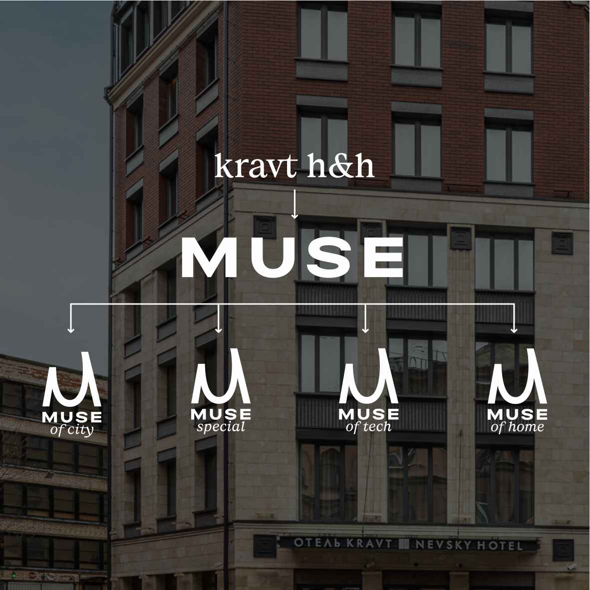Muse предложит гостям выбирать и создавать впечатления благодаря разнообразию форматов проживания. В линейку бренда будут входить: Muse Special (бутик— и 5-звёздочные отели), Muse of City (городские отели 3*, 4*), Muse of Home (сервисные апартаменты, апарт-отели) и Muse of Tech (гостиничные объекты с использованием передовых технологий и особенным местоположением в рамках наукоградов, IT-кластеров и т.п.). В дальнейшем возможно появление новых суббрендов Muse. Центральный логотип построен на графичном соединении букв «М» и «U», символизирующих Музу (Muse) и Гостя (U=You, в переводе «ты») — того, кто вдохновляет, и того, кто ищет впечатлений.