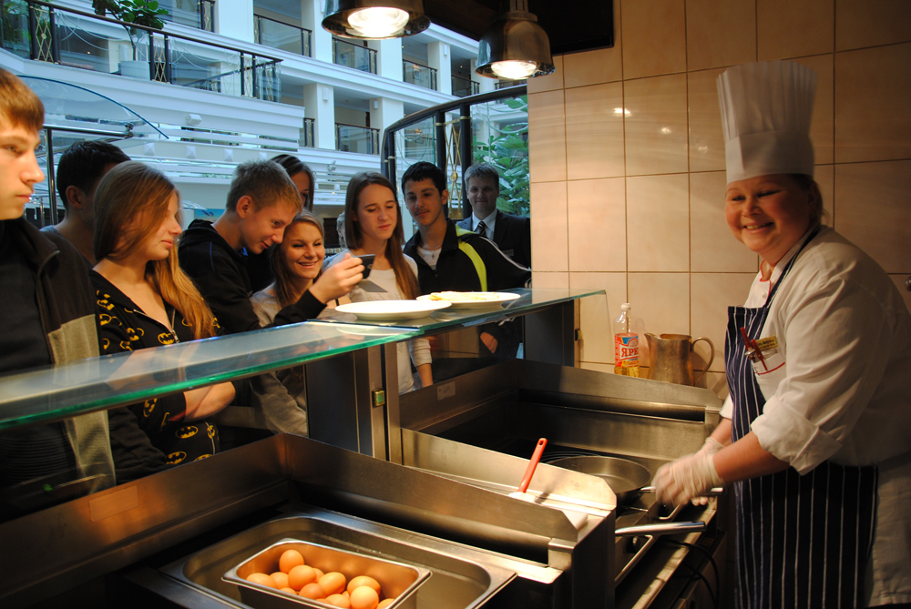 Визит ребят из Брянска начался с экскурсии по отелю. Затем многие отделы распахнули свои двери перед гостями, а их сотрудники поделились секретами профессий. Горничные рассказали о том, как идеально заправить постель за пять минут, на кухне повара продемонстрировали как приготовить воздушный омлет. В заверешение краткого курса по ориентации ребята научились готовить отличный коктейль.