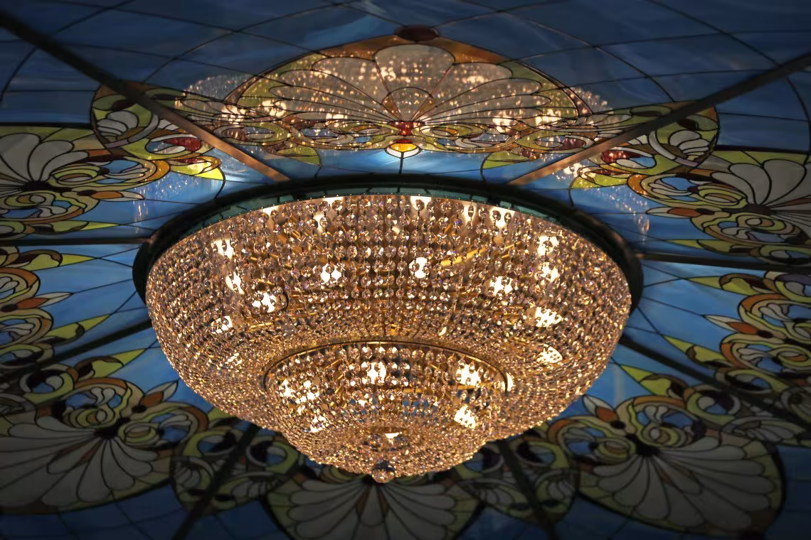 Еще пару фишек в SPA-комплексе и оформлении лестничных пролетов. Исключительная дизайнерская идея - полусферический центр радиусного потолка бассейна в SPA, состоящей из "Платоновых тел" иначе говоря, правильные многогранники, реализовалась в конструкции, изготовленной из акрила с фотопечатью и внутренней подсветкой. Кроме этого, мастерски выполнено ограждение лестницы, ведущей их холла на купольный этаж, здесь используются латунные элементы и вставки в виде натурального оникса, которые подчеркивают изящество линий лестницы отеля.