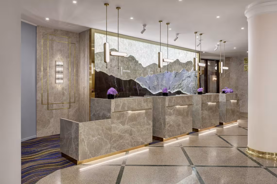 Перед  зоной панно тоже произошли изменения: вместо единого монументального, выполненного из темных материалов стола для регистрации гостей, появились  4 изящные стойки из светлого мрамора, подсвеченные сверху лёгкими светильниками. Благодаря этому решению лобби отеля заиграло новыми красками, став более ярким и выразительным, при этом границы между гостем и отелем были стерты, сделав их ближе к друг другу.