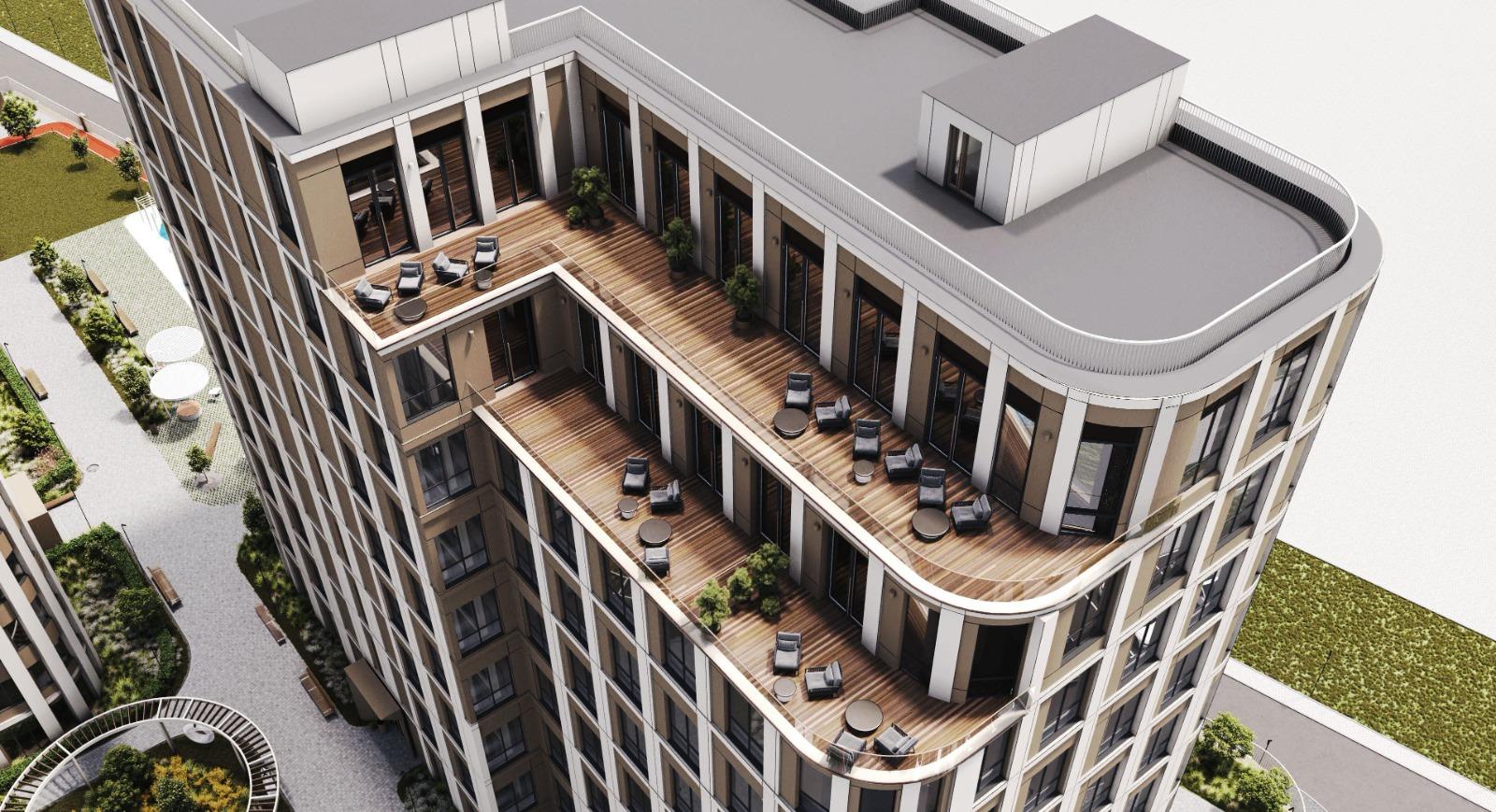 Проект будет состоять из 24-этажного апарт-отеля на 585 номеров и 10-этажного бизнес-центра с террасами на последних этажах. Обе башни объединит стилобат, на котором появятся ландшафтные беседки для комфортной работы на свежем воздухе, воркаут-зона и беговая дорожка длиной 450 метров. Первый этаж займут магазины, кафе, рестораны, фитнес-клуб, а также общее лобби для апарт-отеля и офисного здания с ресепшн, зонами отдыха и коворкингом.