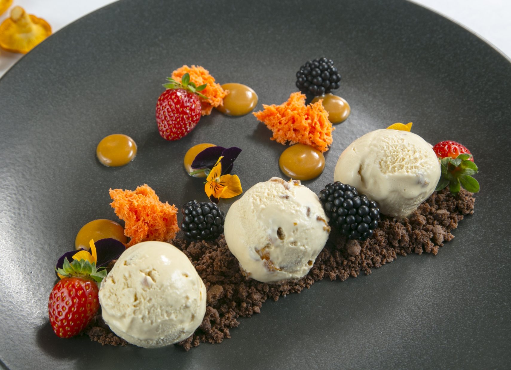 - Домашнее мороженое из лисичек со свежими ягодами и острым карамельным соусом.