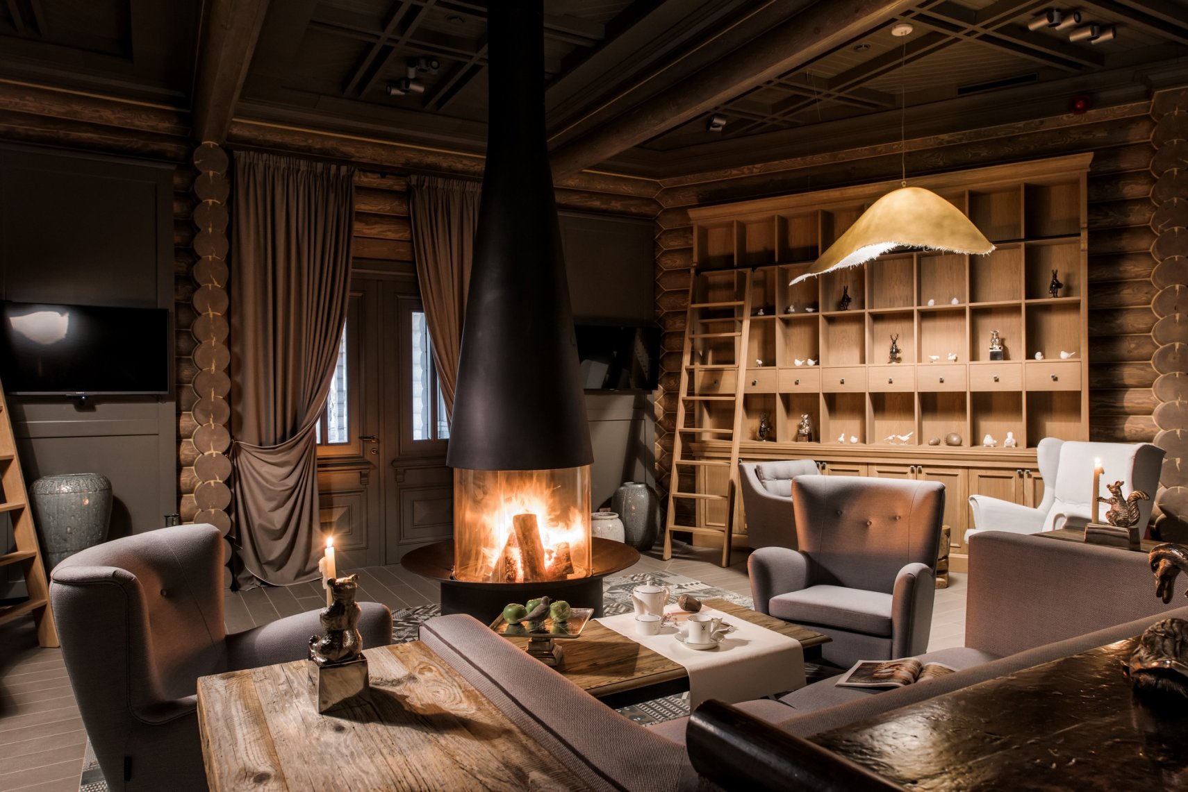 Коттеджи построены из ангарской сосны, известной своим тонизирующим эффектом. Дизайн номеров и общественных зон выглядит экологично и одновременно стильно, винтажная мебель соседствует с необарочными светильниками и зеркалами, стены украшают старинные ружья и охотничьи трофеи – традиционные атрибуты аристократического загородного дома. Сделанная на заказ кружевная чугунная лестница в Большом охотничьем доме могла бы идеально вписаться в интерьер парижского особняка конца XIX века.