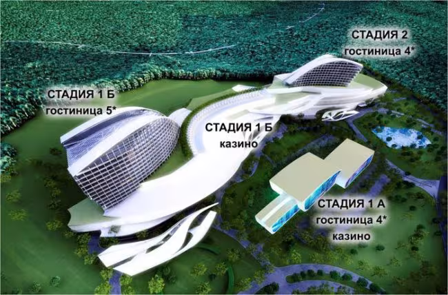 По сообщению пресс-службы администрации Приморского края, строительство будет проходить в несколько этапов, первый из которых начнётся в этом году. Параллельно с возведением 4-звёздочной гостиницы инвестор начнёт работу над 5-звёздочным отелем, который рассчитан на 475 номеров, с казино на 1 100 игровых автоматов и 239 игровых столов. В эту стадию строительства планируется включить и работу по возведению спа-комплекса, баров, ресторанов и конференц-залов. По проекту, комплекс будет готов к 2019 году. Когда отель введут в эксплуатацию, его можно будет использовать и для проведения мероприятий.