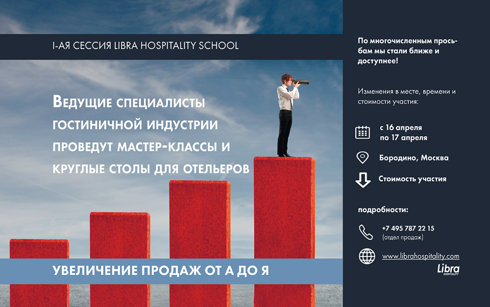 С 16 по 17 апреля в бизнес-отеле Бородино (Москва) состоится I сессия Libra Hospitality School. Тема встречи: «Увеличение продаж от А до Я»