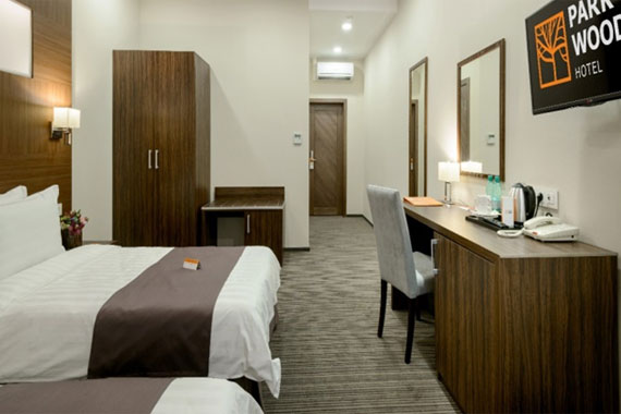 Интерьер и декор Park Wood hotel выполнены в традициях минимализма. Цветовая гамма состоит из двух-трех тонов природной гаммы (коричневый, беж, а также серо - бело-оранжевые контрасты). В качестве фактур использованы экологичные материалы: дерево, бумага, натуральные ткани.