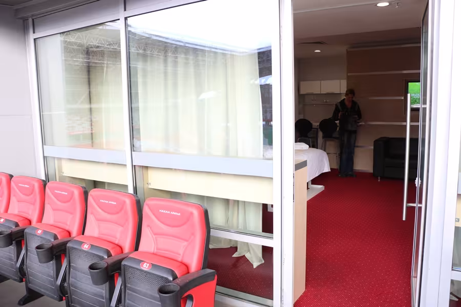В Stadium Hotel гости могут разместиться в одном из 12 номеров категорий «комфорт» и «люкс» с видом на чашу 45-тысячного стадиона. Уточняется, что в дни спортивных и других мероприятий номера могут использоваться в качестве VIP-лож.