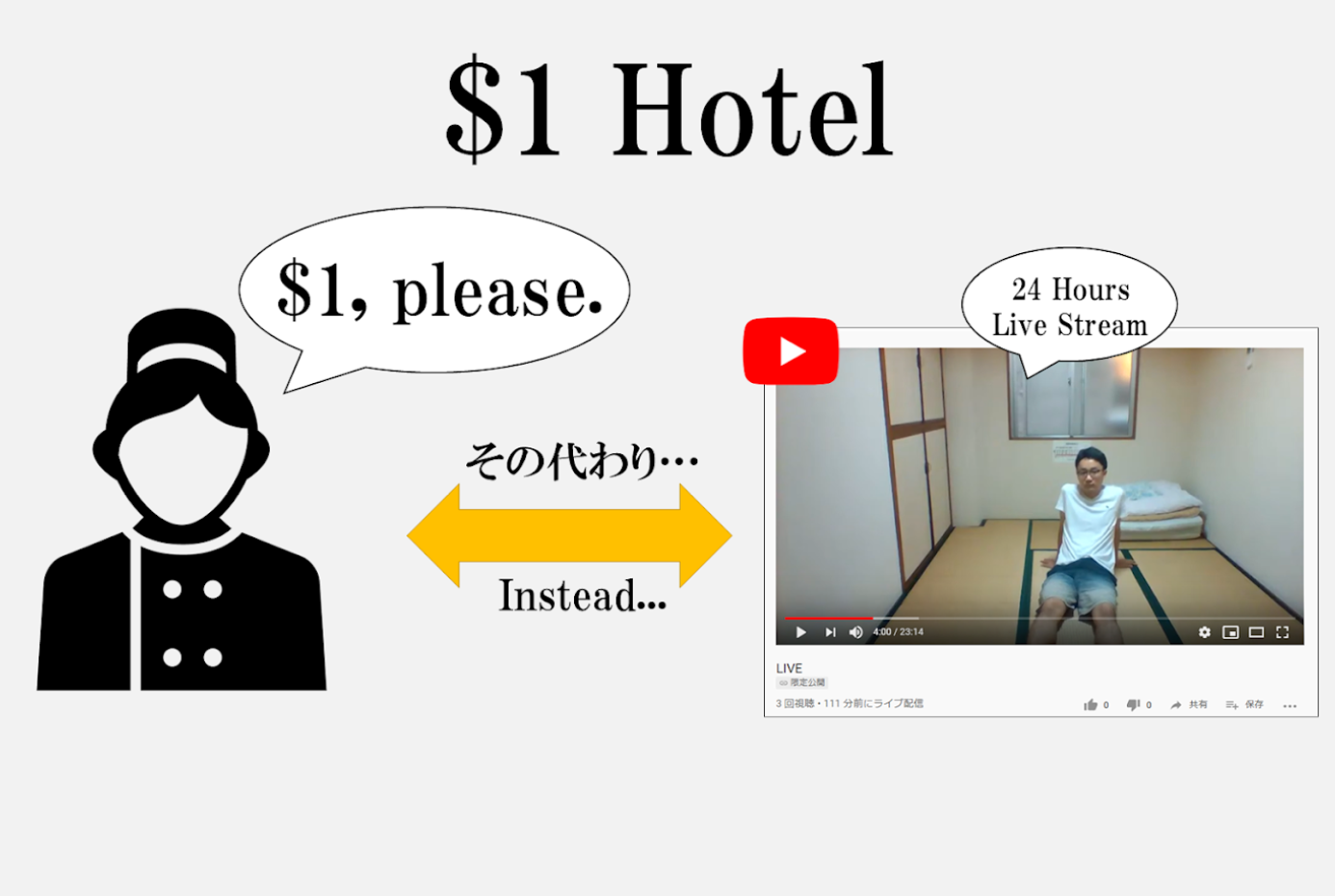 Номер восьмой в японском отеле Ryokan Asahi (г.Фукуока) – особенный: сутки здесь обойдутся любому туристу всего в сотню йен, что эквивалентно одному доллару США. Однако для этого необходимо заранее дать согласие на «ночевку в прямом эфире»: видео транслируется 24/7 на собственный YouTube-канал гостиницы под названием One Dollar Hotel.