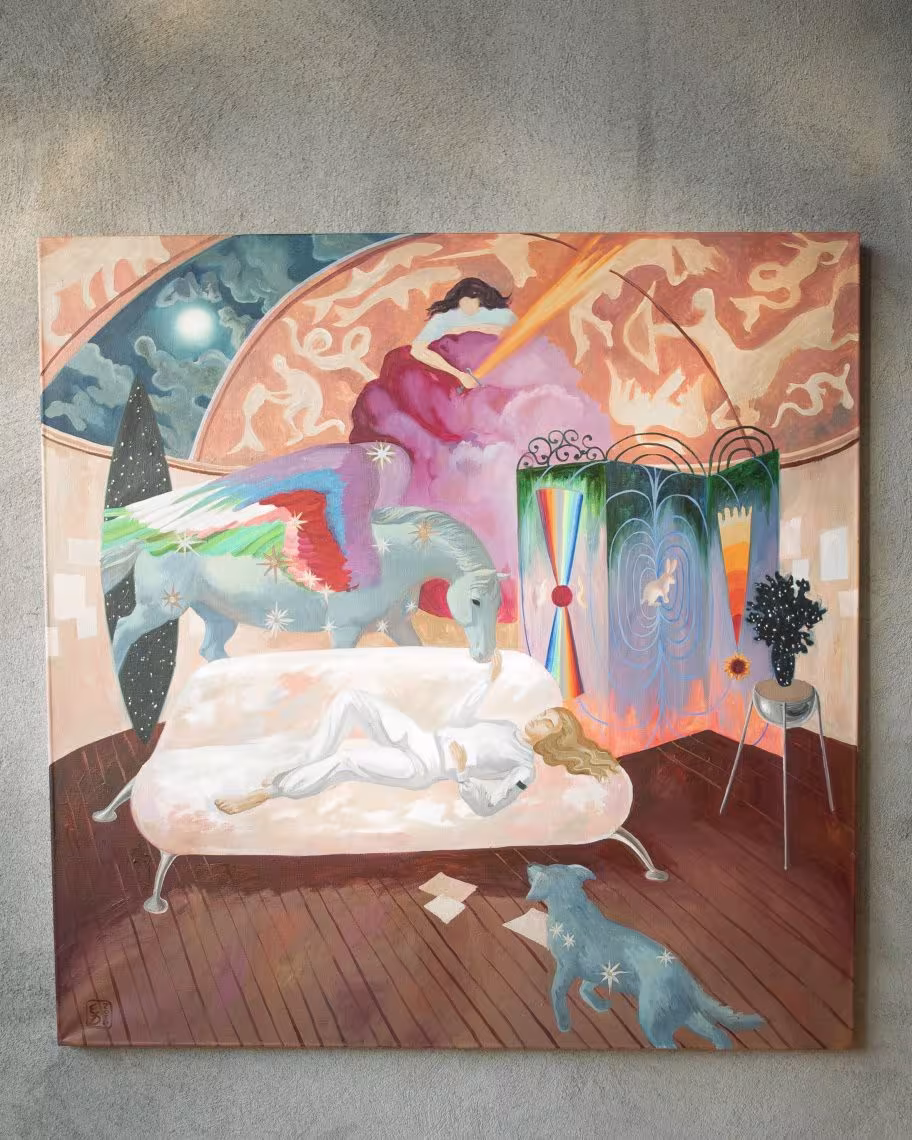 «Кроме нас существует множество других миров. Когда контуры между мирами истончаются, мы можем увидеть их проявления в собственной жизни или во снах.. Космос той вселенной, которую я рисую, не связан с ракетами и технологиями, это космос, по которому путешествует наше бессознательное. И портал в эти космические путешествия находится внутри нас», — комментирует свой проект художник Евгения Дудникова.