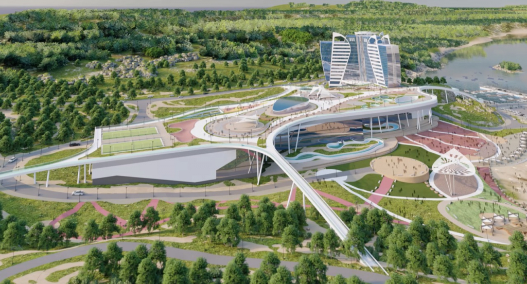 В настоящее время проект находится на стадии финализации концепции и подготовки проектной документации. Его развитие будет проходить в два этапа: на первой стадии планируется возвести аквапарк с гостиницей, торгово-развлекательным комплексом и фудкортами, а также спортивно-оздоровительным центром, главной площадью и парково-прогулочной зоной. Второй этап включает создание благоустроенной прибрежной полосы, видовых площадок, морского бульвара, здания яхт-клуба и пирса для стоянки яхт и катеров.