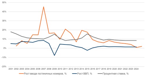 График 5 сопоставляет между собой динамику ввода новых гостиничных номеров, а также динамику изменения ВВП и процентной ставки