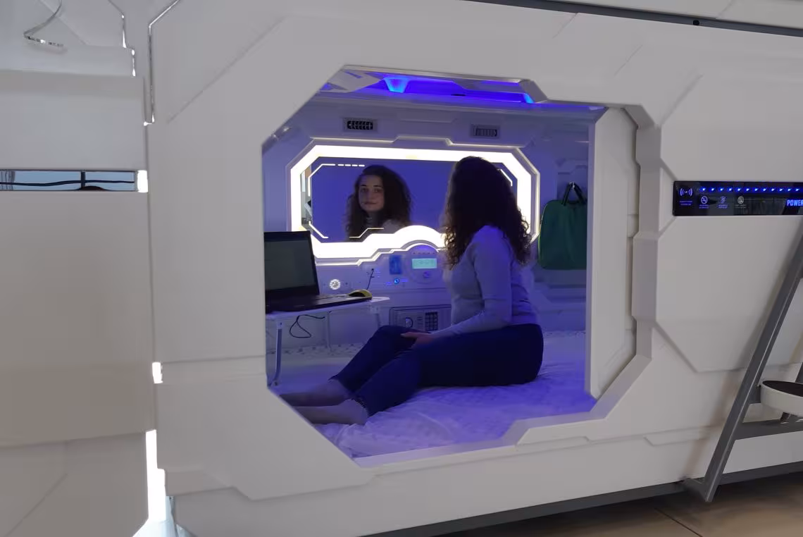 Каждая капсула - это комфортное спальное место с двуспальной кроватью с ортопедическим матрасом и подушками с "эффектом памяти". Ширина капусулы 160 см, длина - 200 см, а высота - 115 см). Капусула оборудована ТВ, индивидуальной системой вентиляции с возможностью регулирования, освещением, электрическими розетками 220V и USB для подзарядки мобильных устройств, столиком для ноутбука, сейфом и зеркалом с подсветкой.