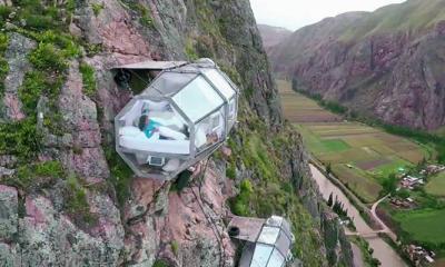 На отвесной перуанской скале появилась экстремальная гостиница с прозрачными номерами, висящими над пропастью. Они расположены на высоте 400 метров от земли